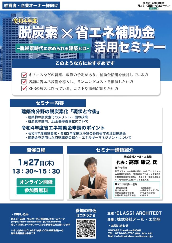 本セミナーでは当社代表の高澤が講師を務め、「建築分野の脱炭素化『現状と今後』」、「令和4年度省エネ補助金申請のポイント」についての講演を行います。