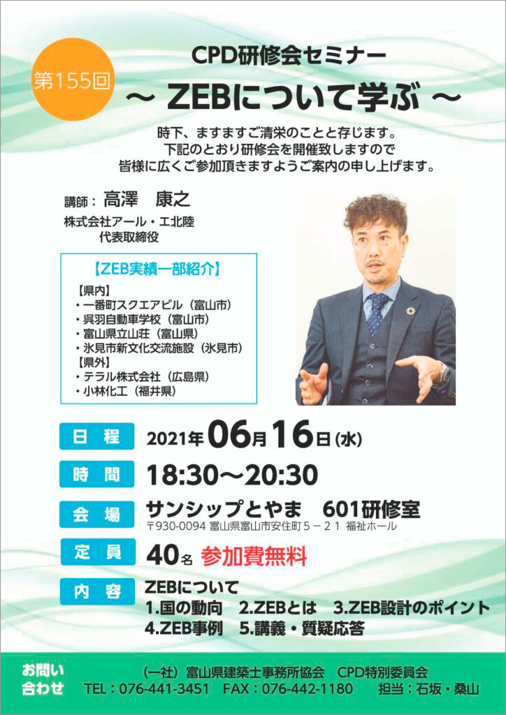 2021年度6月16日(水)に第155回CPDセミナー~ZEBについて学ぶ~が開催されます。本社代表である高澤が講師を務め、国の動向や事例を交えてZEBについて講演を行います。興味のある方はぜひご参加ください。お問い合わせについてはチラシ下部、もしくは当社... -