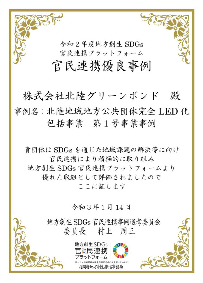 内閣府が設置する地方創生SDGs官民連携プラットフォームの「官民連携優良事例」に北陸グリーンボンド株式会社で取り組んだ「北陸地域地方公共団体完全LED化包括事業 第1号事業事例」が採択されました。 内閣府地方創生SDGs官民連携プラットフォーム 北陸... -